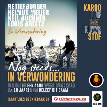 Janine gesels met 3 uit die vier manne wat 10 jaar gelede in Sutherland 'n naweek gaan spandeer het, en daaruit die CD “In Verwondering” die lig laat sien het. Dis 2:30AM in Amerika, so Louis Brittz kon nie saamgesels nie, maar Neil Büchner, Retief Burger en Helmut Meijer staan…