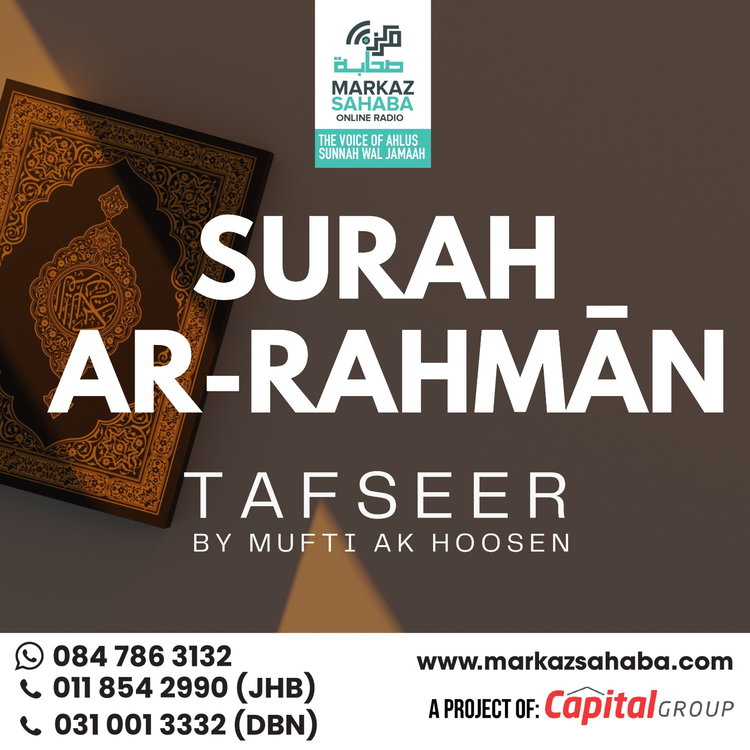 Tafseer Of Sura Ar-Rahman- Presented by Mufti A.K. Hoosen, a globally respected scholar known for his deep insight, authentic scholarship, and clear presentation, this Tafseer brings together classical explanations with practical guidance for the modern believer