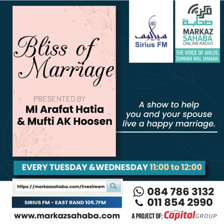 Tune to Bliss of Marriage every Tuesday & Wednesday from 11am - 12pm. A show to help you and your spouse to live a happy marriage Listen Live - https://ndstream.net/markazsahaba/pc.htm https://radio.garden/listen/markaz-sahaba/DkHOTqbS