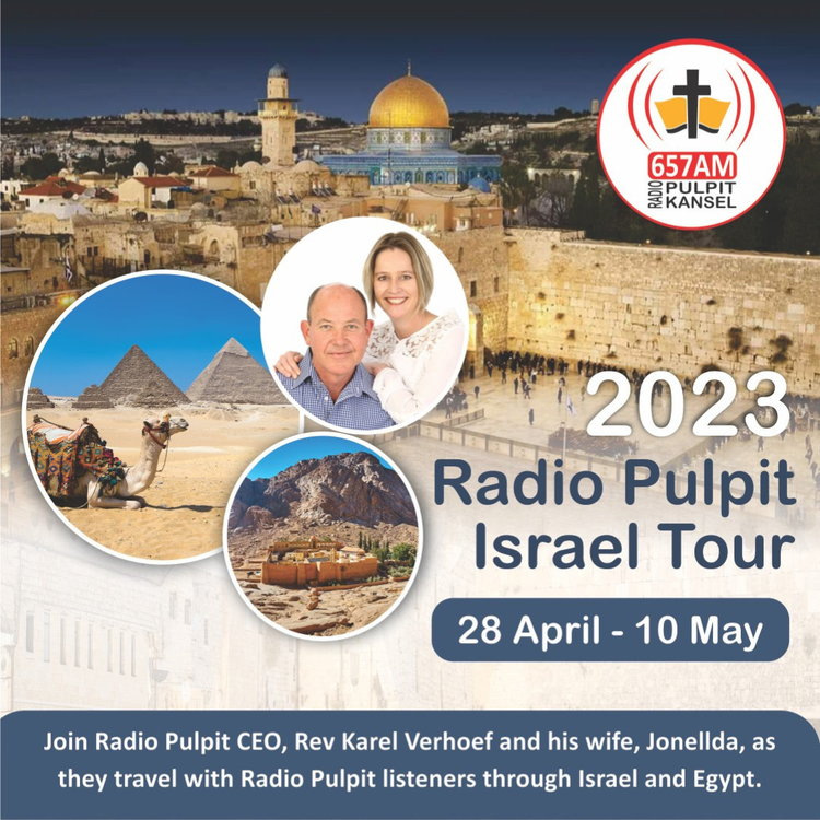 Saam met ons in die ateljee is Besturende Direkteur van Radiokansel, ds Karel Verhoef. Hy deel vandag baie opwindende nuus met ons. Vir die eerste keer in byna drie jaar gaan ons weer 'n Radiokansel toer na Israel aanbied.