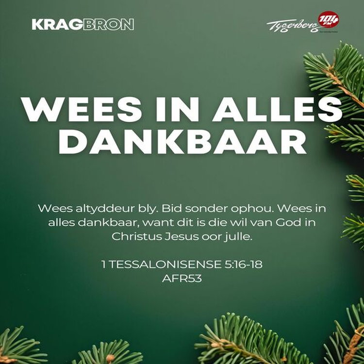 Wees altyddeur bly. Bid sonder ophou. Wees in alles dankbaar, want dit is die wil van God in Christus Jesus oor julle. I THESSALONICENSE 5:16-18 AFR53